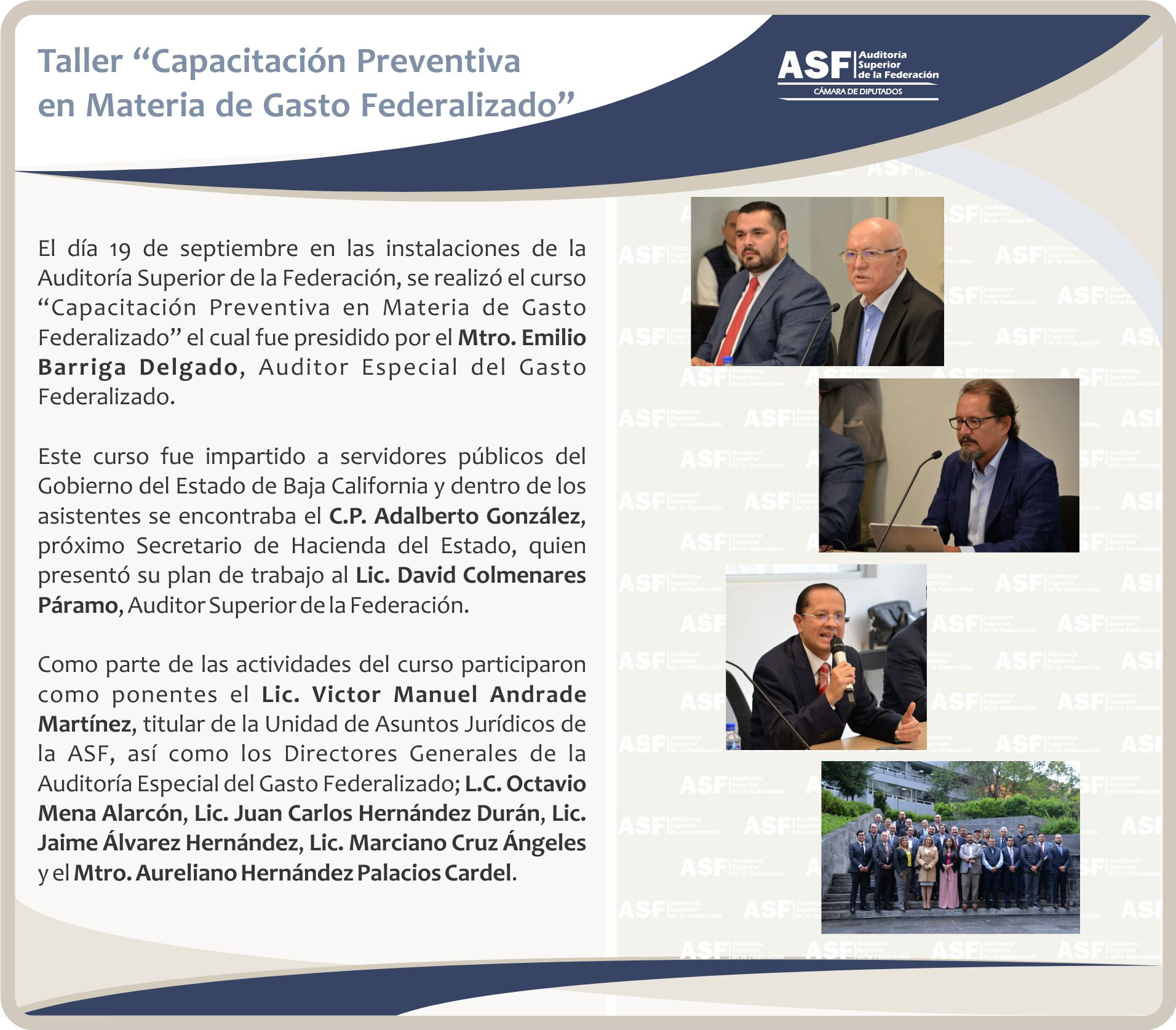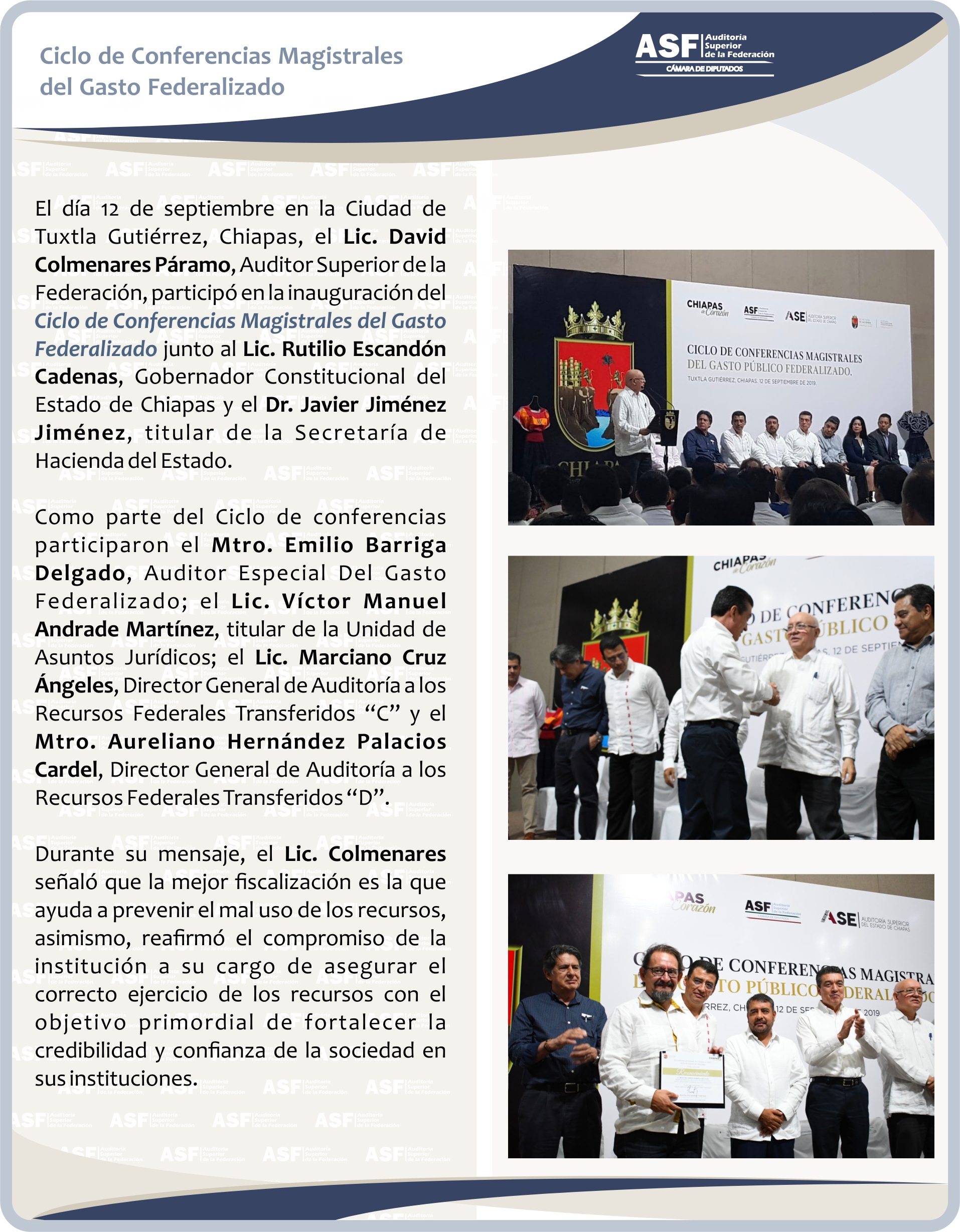 La Auditoría Especial del Gasto Federalizado de la Auditoría Superior de la Federación impartió un Taller dirigido a Servidores Públicos, Presidentes Municipales y Funcionarios del Equipo de Transición en el Estado de Chiapas, con el fin de coadyuvar el correcto ejercicio de los Recursos Federales.