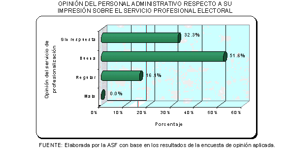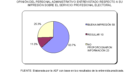 Al solicitarse la opinión de los entrevistados respecto al servicio profesional electoral, 58 (63.7%) manifestaron que tenían una buena impresión; 10 (11.0%) regular y los restantes 23 (25.3%) no proporcionaron información al respecto. Cabe destacar que el personal administrativo que manifestó tener mala o regular impresión respecto al servicio, omitió especificar los motivos que sustentan su opinión.