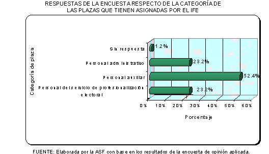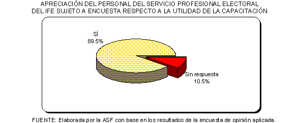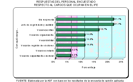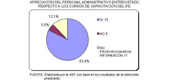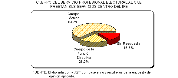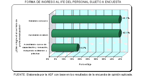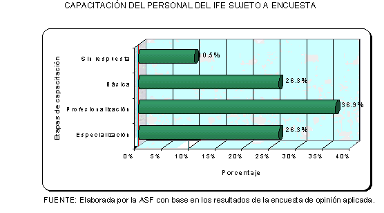 A 19 personas encuestadas del servicio de profesionalización electoral se les preguntó respecto a las etapas de capacitación que habían aprobado dentro del servicio de carrera a lo que respondieron lo siguiente: 7 (36.9%) profesionalización, 5 (26.3%) básica, 5 (26.3%) especialización y de 2 (10.5%) no se obtuvo respuesta. Cabe señalar, que 8 (42.1%) ingresaron al servicio de profesionalización electoral del IFE mediante concurso; otras 8 (42.1%) aprobaron examen y 3 (15.8%) acreditaron cursos de capacitación y formación, incluyendo exámenes y práctica.
