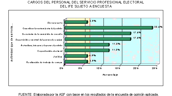 De las 19 personas que forma parte del servicio de profesionalización electoral, se determinó que:12 (63.2%) pertenecen al cuerpo técnico, 4 (21.0%) son del cuerpo de la función directiva y 3 (15.8%) no proporcionaron respuesta. Además, 4 (21.1 %) no informaron respecto al cargo que desempeñaron; 4 (21.1 %) son jefe de seguimiento y análisis; 3 (15.7%) vocales ejecutivos; 2 (10.5%) vocales de organización; 2 (10.5%) vocales distritales; 2 (10.5%) vocales de registro de electores; 1 (5.3%) vocal secretario y 1 (5.3%) vocal de capacitación electoral.