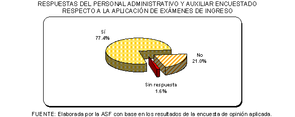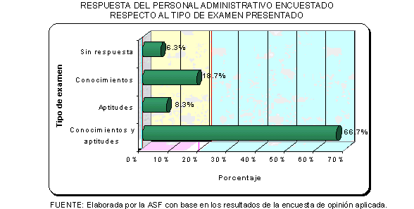 De las 48 personas que presentaron examen, 32 (66.7%) señalaron que el examen fue de conocimiento y aptitudes; 9 (18.7%) de conocimientos; 4 (8.3%) de aptitudes y 3 (6.3%) no respondieron.