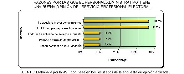 De las 32 personas que tienen una buena opinión del servicio profesional electoral, sólo 11 expusieron las razones para calificarlo de esa manera, de ellos 4 porque se adquieren mayores conocimientos; 4 porque el IFE cumple mejor sus funciones, 1 ya todo se ha aplicado de acuerdo al puesto; 1 en virtud de que permite desarrollo dentro del IFE, y 1 porque se brinda confianza a la ciudadanía.