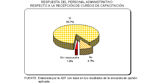 De las 55 personas que han recibido cursos de capacitación, 49 (89.1%) consideran que los cursos les han sido de utilidad en el desempeño de sus labores, ya que se aplican de acuerdo con el puesto, el personal se desempeña con mayor eficiencia, brindan mejor capacitación a la ciudadanía y actualizan conocimientos; 4 (7.3%) no respondieron y 2 (3.6%) consideran que no han sido de utilidad en virtud de que están mal planeados y no se impartieron cursos intensivos.
