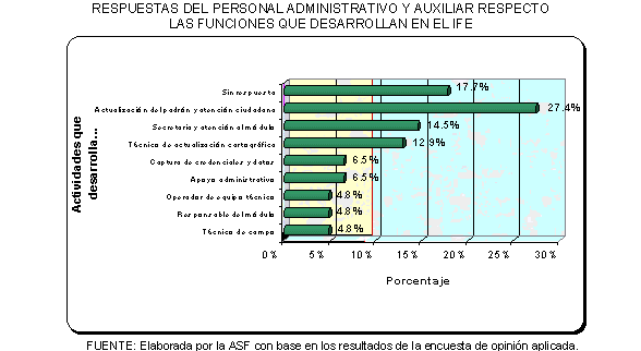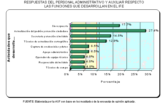 De las 17 personas que manifestaron que los cursos de capacitación impartidos por el Centro de Formación y Desarrollo del IFE les habían sido útiles en el desempeño de sus labores, 4 (23.5%) desarrollan actividades de coordinar levantamiento del padrón, 3 (17.6%) de secretario de la comisión de vocalía, 3 (17.6%) de supervisión y control del personal y equipo, 2 (11.8%) actualiza, integra y depura el padrón, 2 (11.8%) en capacitación electoral, 1 (5.9%) desarrolla actividades en jurídico, 1 (5.9%) realiza trabajo de campo y 1 más (5.9%) no respondió.