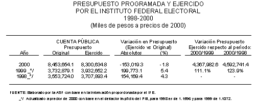 Por lo anterior, el análisis que se presenta está referido a explicar el comportamiento en el ejercicio del presupuesto respecto del autorizado al IFE en 2000, así como en comparación con los ejercicios de 1998 y 1999. Los resultados se comentan a continuación.
