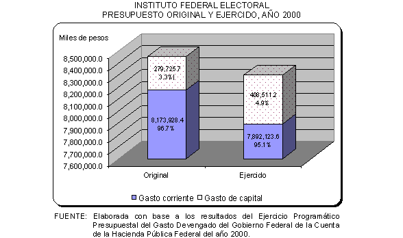 El presupuesto ejercido por el IFE durante 2000, fue superior a los importes ejercidos en los ejercicios de 1998 y 1999, en 4,592,741.4 y 4,367,982.6 miles de pesos,[1] respectivamente, lo que significó un incremento en el gasto de 123.9% y 111.1% en términos reales, respectivamente, situación que se explica en gran medida por la actividades llevadas a cabo con motivo de la realización de las elecciones federales del año 2000.