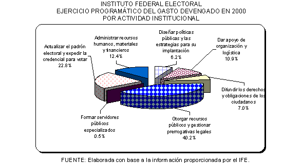 Durante el 2000, a fin de cumplir con la función de Organización de los Procesos Electorales el IFE llevó a cabo la realización de siete actividades institucionales, para las cuales destinó el total de su presupuesto ejercido por 8,300,634.8 miles de pesos conforme a la distribución que se muestra en la gráfica siguiente: