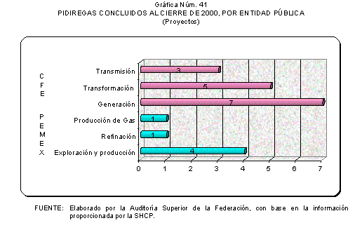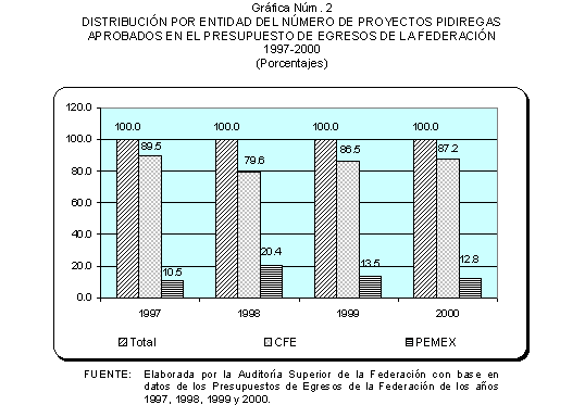 En cuanto al número de proyectos aprobados en Presupuesto de Egresos de la Federación, el mayor porcentaje correspondió a CFE con el 85.7% en promedio de 1997 a 2000, contra el 14.3% para PEMEX, según se aprecia en el cuadro y gráfica siguientes.