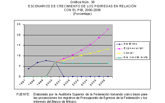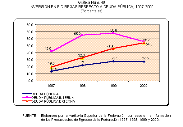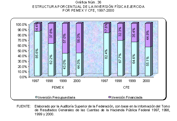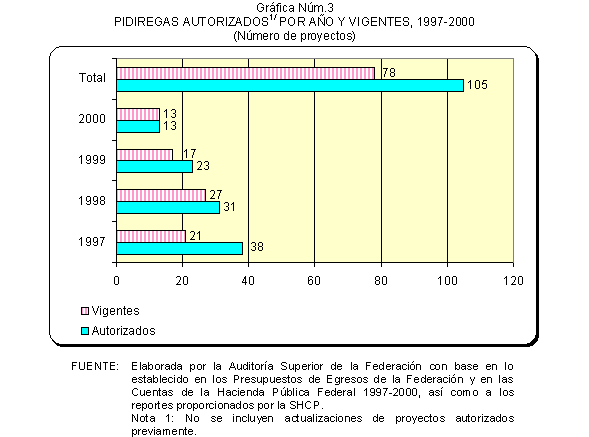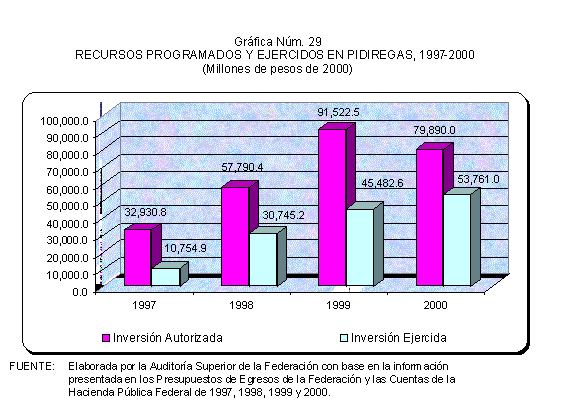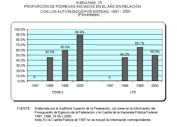 De 1997 a 2000, las solicitudes de autorización de recursos de inversión pública financiada para la realización de proyectos PIDIREGAS para CFE y PEMEX evolucionó para pasar de un monto equivalente a 123.9 miles de millones de pesos (3.9% del PIB) a 385.5 miles de millones de pesos (7.1% del PIB). Las autorizaciones más significativas correspondieron a PEMEX y representaron en promedio un 73.0% en tanto que para CFE significaron un 27.0% en promedio, de acuerdo con lo que se muestra en el cuadro y gráfica siguientes.