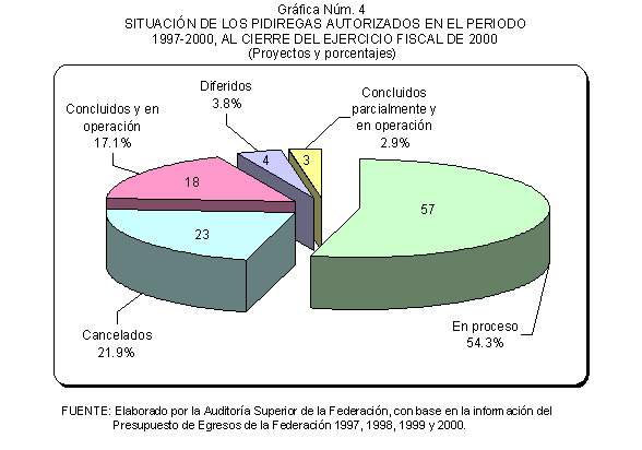 Al cierre del ejercicio fiscal de 2000, del total de los 105 proyectos autorizados, 78 proyectos se encontraban vigentes, 57 (54.3%) estaban en proceso de construcción, adjudicación y autorización; 18 (17.1%) se encontraban concluidos totalmente y en operación; y, 3 (2.9%) registraban cierres y operaciones parciales. Respecto de los autorizados pero no vigentes que sumaron un total de 27 proyectos, 23 (21.9%) se habían cancelado y 4 (3.8%) estaban diferidos, según se muestra en la gráfica siguiente.