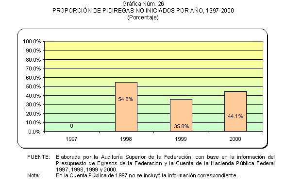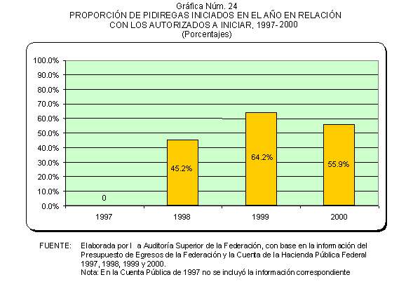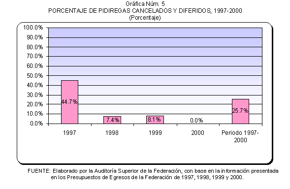 Las cifras por año muestran que de los proyectos aprobados en 1997, el 44.7% se canceló; para 1998, el 7.4%; para 1999, el 8.1%; y en 2000, el 0.0%. El número de proyectos cancelados y diferidos representaron el 25.7% del total de los proyectos autorizados en el periodo 1997-2000, como se muestra en la gráfica siguiente.