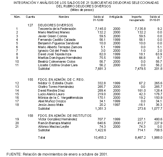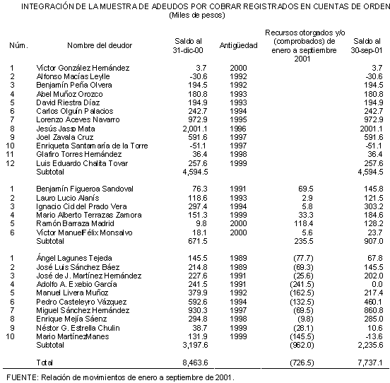 Con la póliza 171 de fecha 30 de abril de 2001, los cuatro adeudos fueron dados de baja contablemente, de conformidad con el acuerdo núm. 17.03.99 del Órgano de Gobierno, por los montos registrados en la Estimación para Cuentas Incobrables (INEISACH por 81.0 miles de pesos, Grupo Constructor Balcones del Mar, S.A. de C.V., por 238.7 miles de pesos, María C. Olmedo Bolaños por 2.7 y Ma. Liliana Gonzaga Villalobos por 1.0 miles de pesos).