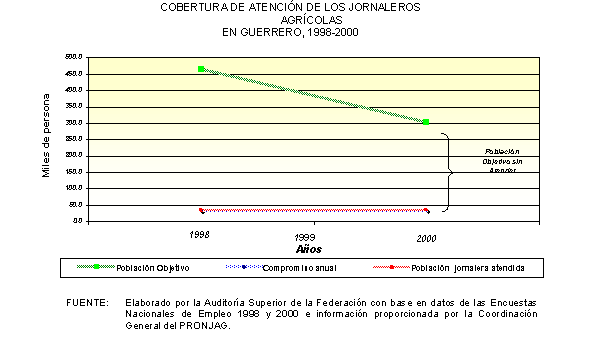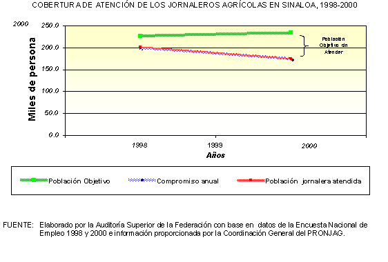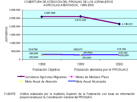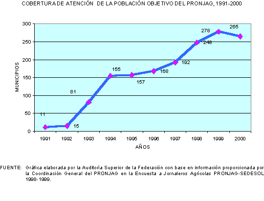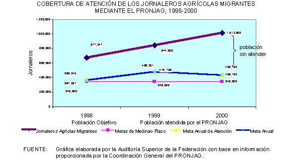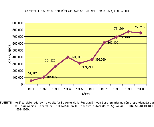 De acuerdo con la información proporcionada por la Coordinación General del PRONJAG, en el periodo de 1991 a 2000 la cobertura de la población objetivo del programa creció a una tasa promedio anual de 34.6%, al pasar de 51,812 jornaleros atendidos en 1991, a 753,285 en 2000.