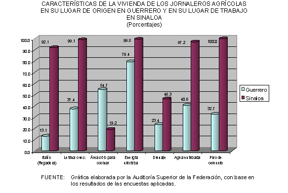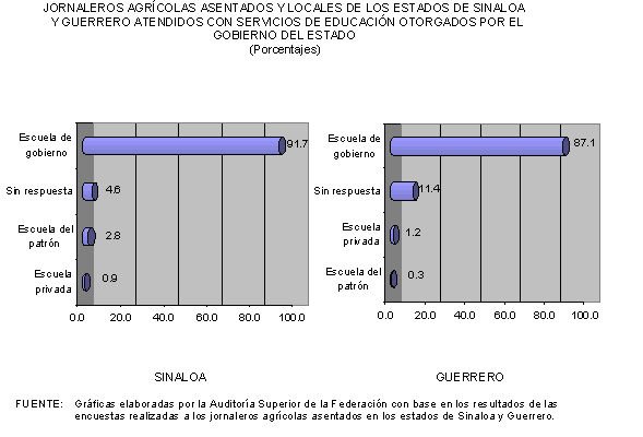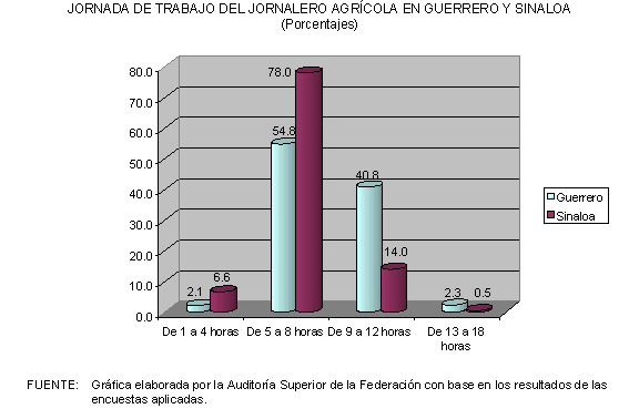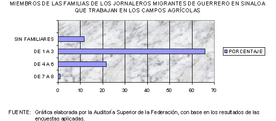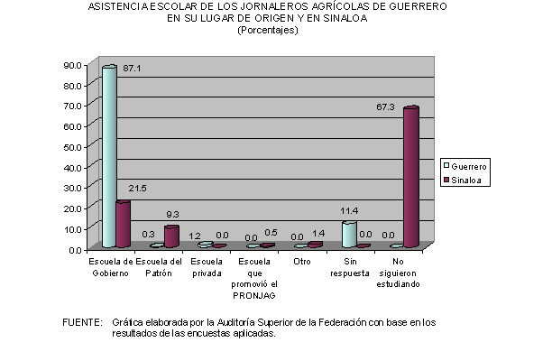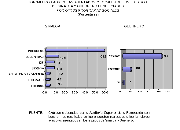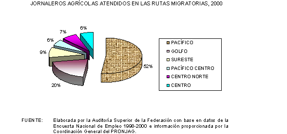 Asimismo, con el apoyo de la Universidad Nacional Autónoma de México (UNAM), la Auditoría Superior de la Federación llevó a cabo el levantamiento de una encuesta de opinión entre los beneficiarios del Programa Nacional con Jornaleros Agrícolas PRONJAG en los estados de Sinaloa y Guerrero. Para tal efecto se aplicaron 1,121 cuestionarios en ambas entidades federativas, 456 a jornaleros agrícolas migrantes en Sinaloa, 214 a migrantes originarios de Guerrero en los campos de Sinaloa, 108 a jornaleros asentados y locales de Sinaloa y 343 a una población de Guerrero. En todos los casos los cuestionarios se aplicaron a jefes de familia y se visitaron ocho campos de trabajo y dos localidades en los municipios de Culiacán y El Rosario, en Sinaloa; mientras que en Guerrero se visitaron cinco localidades y una unidad de servicios integrados en los municipios de Tixtla y Chilapa.