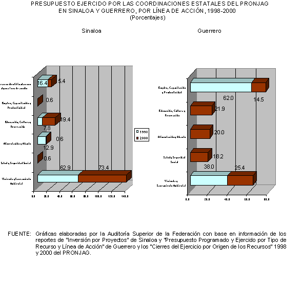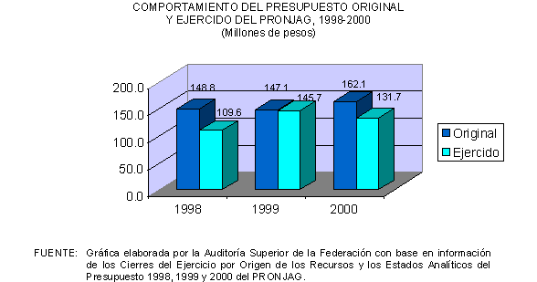 De acuerdo con las Reglas de Operación de 2000 del PRONJAG, del presupuesto anual aprobado en ese año el 25.0% se destinaría a promover las acciones de vivienda y saneamiento ambiental; el 20.0%, a salud y seguridad social; 20.0%, a alimentación y abasto; el 25.0%, a educación, cultura y recreación; y el 10.0%, a desarrollo productivo para promover el empleo, la capacitación y la productividad.