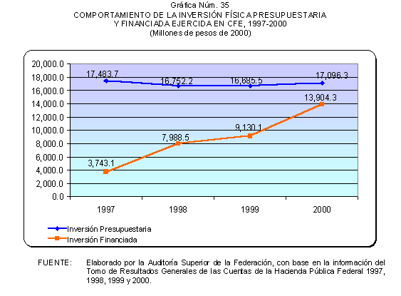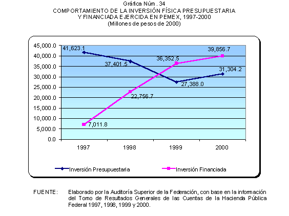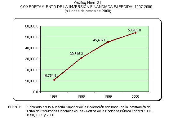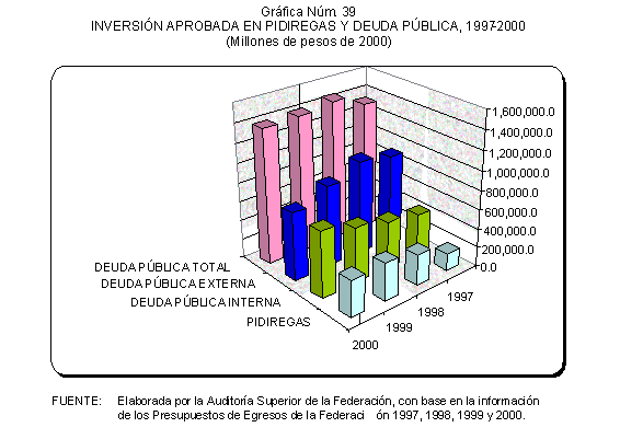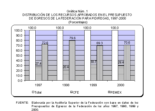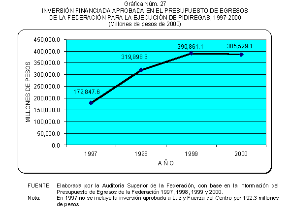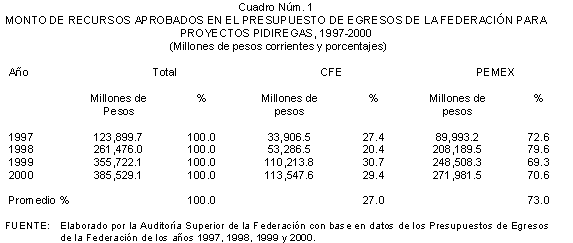 De 1997 a 2000, las solicitudes de autorización de recursos de inversión pública financiada para la realización de proyectos PIDIREGAS para CFE y PEMEX evolucionó para pasar de un monto equivalente a 123.9 miles de millones de pesos (3.9% del PIB) a 385.5 miles de millones de pesos (7.1% del PIB). Las autorizaciones más significativas correspondieron a PEMEX y representaron en promedio un 73.0% en tanto que para CFE significaron un 27.0% en promedio, de acuerdo con lo que se muestra en el cuadro y gráfica siguientes.