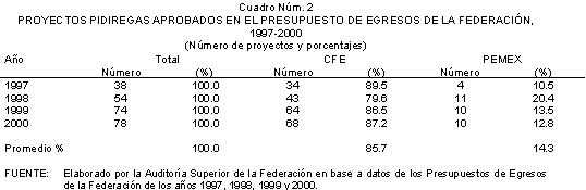 En cuanto al número de proyectos aprobados en Presupuesto de Egresos de la Federación, el mayor porcentaje correspondió a CFE con el 85.7% en promedio de 1997 a 2000, contra el 14.3% para PEMEX, según se aprecia en el cuadro y gráfica siguientes.