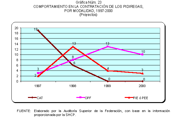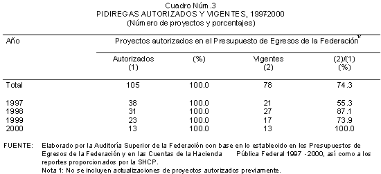 Excepto en 1997 en que una porción menor de los PIDIREGAS se canalizó a la construcción de la red carretera, en el resto de los años comprendidos entre 1997 y 2000 la inversión operada bajo el esquema de inversión pública financiada o PIDIREGAS se concentró en el sector energético y particularmente en PEMEX y CFE, entidades a las que fueron autorizados 105 proyectos en los Presupuesto de Egresos de la Federación de estos años.