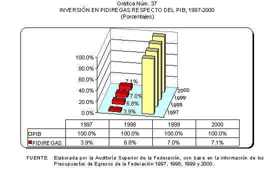 En el ámbito energético esta estrategia se aplicó a través de los esquemas denominados "Proyectos de Inversión Financiada", o "Proyectos de Infraestructura Productiva de Largo Plazo", o "Proyectos de Inversión Productiva de Registro Diferido en el Gasto", también conocidos como "PIDIREGAS", cuya proporción dentro de la inversión productiva total del sector público en el ámbito energético mostró a partir de su inicio en 1997 una tendencia ascendente, que superó a la inversión presupuestaria tradicional y que determinó que como porcentaje del PIB pasaran de representar el 3.9% en 1997 al 7.1% en 2000; en tanto que, para los mismos años dentro del presupuesto federal total su proporción creció de 16.5% a 30.9%.