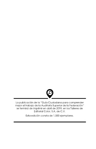 La publicación de la “Guía Ciudadana para comprender mejor el trabajo de la Auditoría Superior de la Federación” se terminó de imprimir en abril de 2019, en los Talleres de Editorial Color, S.A. de C.V. Esta edición consta de 1,000 ejemplares.
